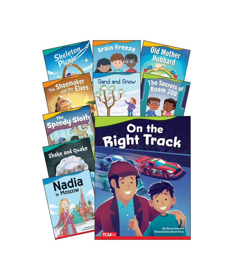 Encourage children to use their imagination with these captivating fiction storybooks! These storybooks contain high-interest text, vibrant illustrations, diverse characters, and a variety of genres to keep children engaged. Ideal for story time at home or in the classroom, each book in this set features age-appropriate text features and increasingly complex vocabulary to support early childhood literacy development. The fiction titles in this 10-book collection include: On the Right Track; Nadia in Moscow; Shake and Quake; The Speedy Sloth; The Shoemaker and the Elves; Sand and Snow; The Secrets of Room 209; Skeleton Picnic; Brain Freeze; and Old Mother Hubbard.