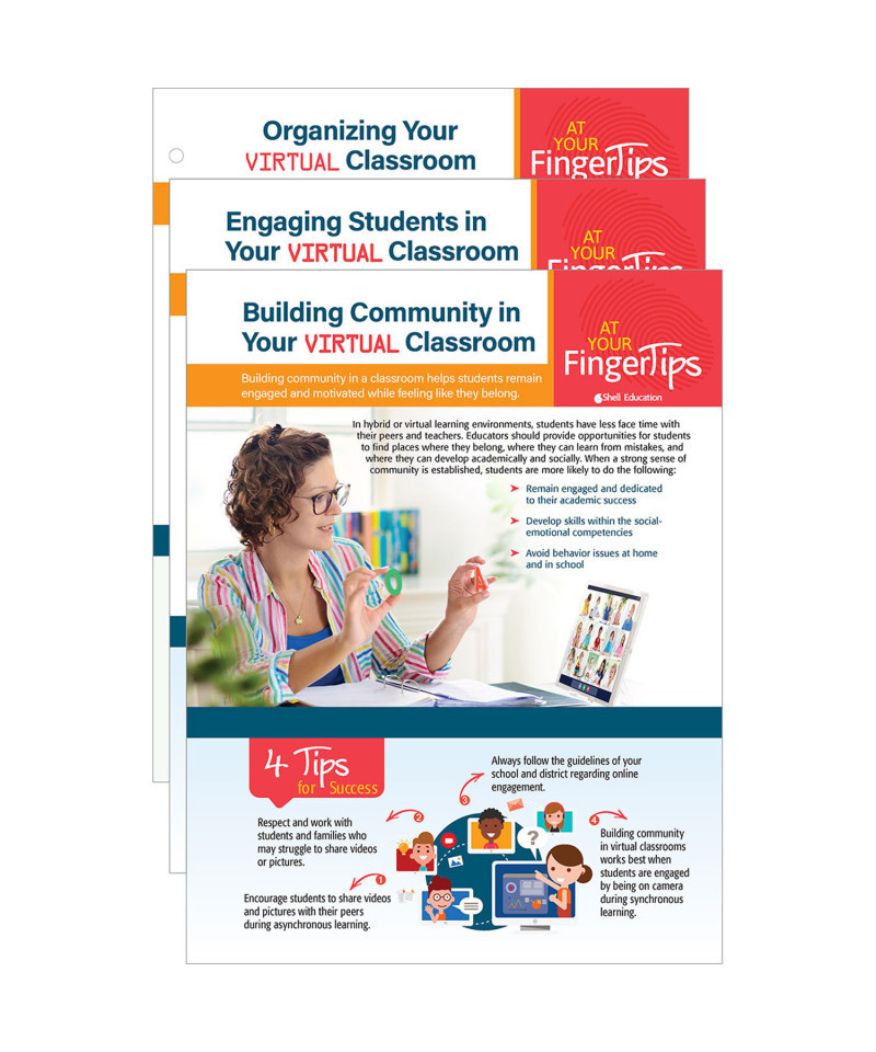 Ready to tackle the new school year...virtually? With this convenient bundle of 3 At Your Fingertips guides, you can gain confidence in your ability to make virtual learning meaningful and effective. These 4-page guides offer exciting strategies to help you navigate distance learning. Whether you're working in a virtual or hybrid learning environment, these easy-to-read guides make the transition to online teaching smoother by providing specific techniques, general guidance, and the foundations for innovation. From setting up your virtual classroom to promoting fun student interaction, these At Your Fingertips guides will help you every step of the way. The 8.5" x 11" 2-panel foldout guides (4 pages), are laminated for durability and 3-hole-punched for easy binder storage.
