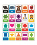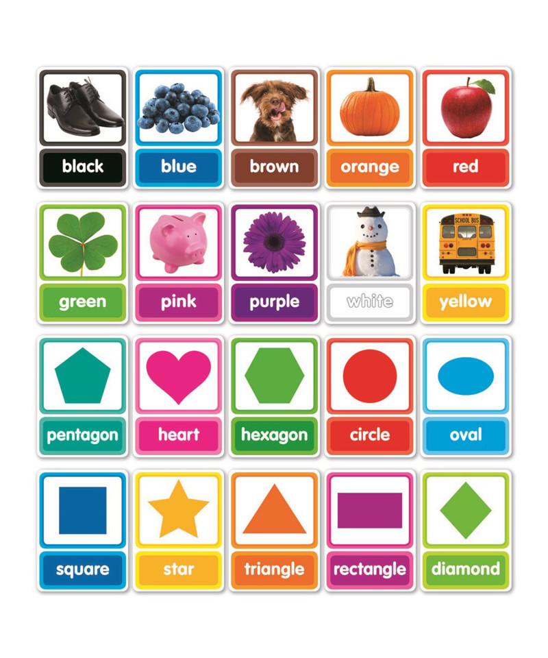 Teach color and shape recognition with these big, brightly colored cards featuring engaging photographs. Includes 10 colors and 10 shapes with corresponding word labels.
