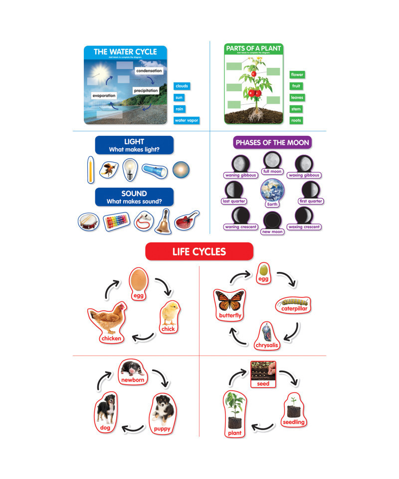 Use this all-in-one interactive bulletin board set to teach the most common science concepts taught in PreK-2 classrooms: life cycles, parts of a plant, phases of the moon, the water cycle, and light and sound. Use the pieces to create anchor charts with students and change out the display as you teach each concept. The interactivity makes learning fun and memorable. Pieces are color coded by science concept for ease of use and easy storage.