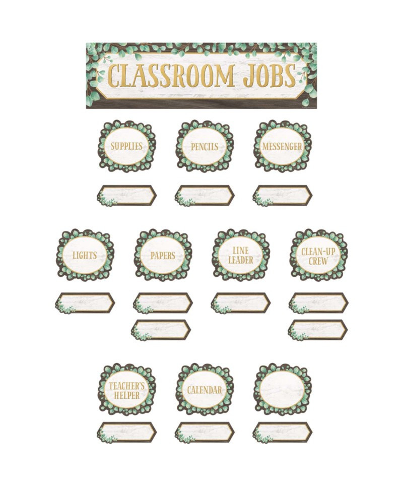Add a delicate, leafy touch to your classroom with this beautiful jobs mini bulletin board. The set includes titles for Calendar, Clean-Up Crew, Lights, Line Leader, Messenger, Papers, Pencils, Supplies, Teacher's Helper, plus blank pieces that you can customize. The header piece measures 21" x 6". Each set includes 49 total pieces.