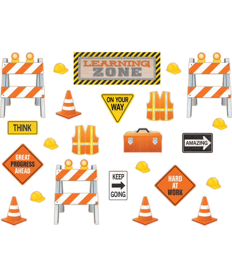 Your crew will love the positive messages and encouraging signs in this construction themed display. Includes 1 "LEARNING ZONE" header piece, 6 signs, 3 construction barriers with 6 matching lights, 4 traffic cones, 2 safety vests, 1 toolbox, and 37 hard hats. Barriers with lights on top measure 12½" x 18½". 60 total pieces.