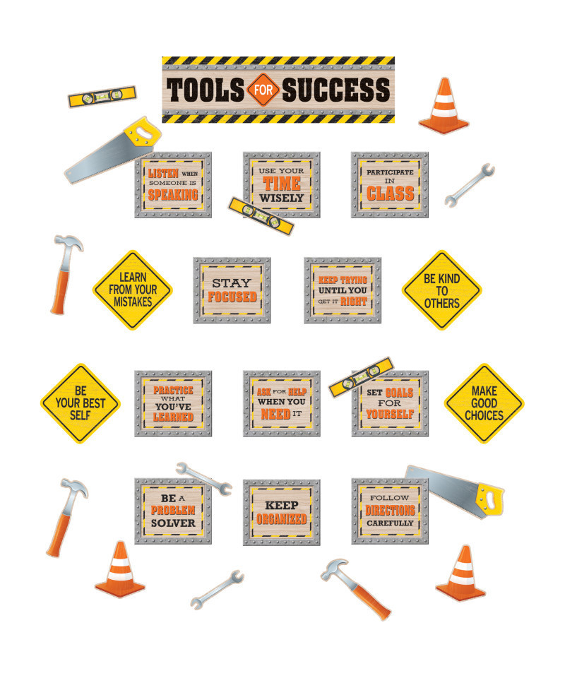 Help motivate your hard-working crew to develop their tools for success! The positive reminders, inspirational quotes, and engaging accents will help keep your team on task and striving toward their goal. Header piece measures 21" x 6". 31 total pieces.