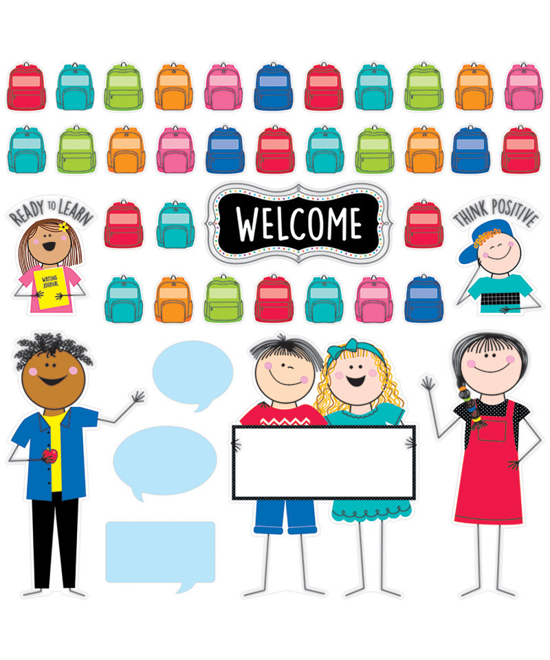 This All Are Welcome Bulletin Board is designed to set an inclusive tone wherever it's displayed. The set features Stick Kids representing diverse backgrounds and includes a colorful array of backpacks that can be personalized for the members of your class or group.