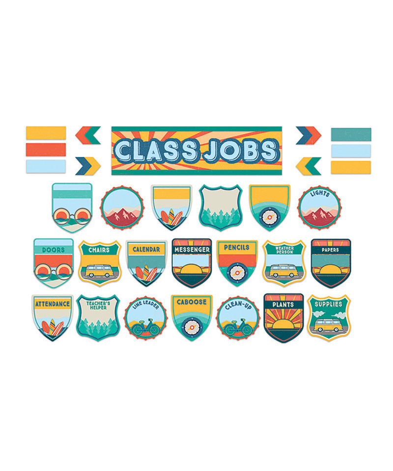 Teach and encourage positive behaviors and responsibility in your classroom with a 57 Piece Eureka Class Jobs Mini Bulletin Board Set. Each set includes 57 pieces packaged as 8 panels: 1 Class Jobs Header, 15 Class Job Badges, 5 Blank Class Job Badges, 32 Name Plates, and 4 Die-Cut Arrows.