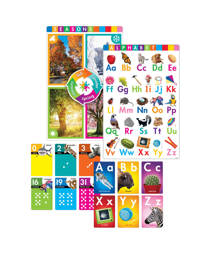 Early FUNdamental Skills Learning Set: Dive into the world of education with these vivid 10-3/4" x 16-1/8" (27.3 cm x 41 cm) punch-out posters. Covering essential topics such as Alphabet, Numbers 1-10, Colors, Shapes, Opposites, Five Senses, Weather, and Seasons, these posters create an immersive learning experience.