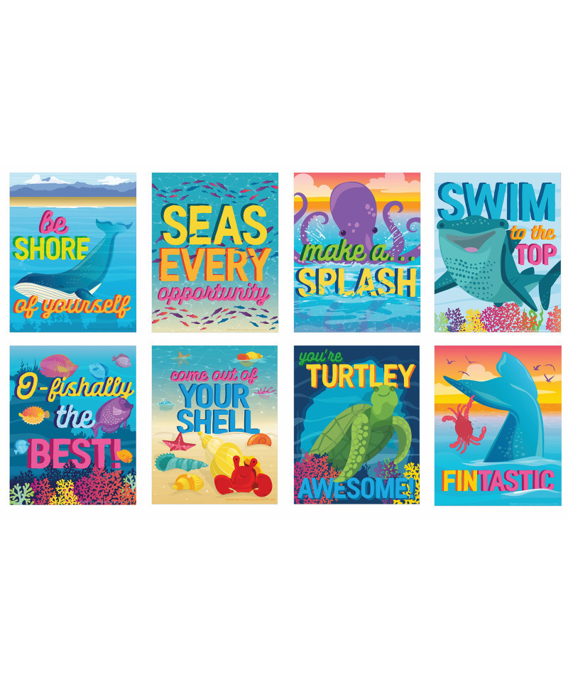 Encourage, inspire, and motivate your students with colorful posters that create an exciting learning environment! Each poster measures 11" x 14" and is printed and pre-cut on reusable heavy weight cardstock. Make a splash! Make your classroom turtley awesome with the Seas the Day collection. Cool ocean vibes, motivational phrases, marine life imagery, and vibrant colors make this theme easy to age up or down. Each Seas the Day Mini Posters Set includes 8 coordinating posters.