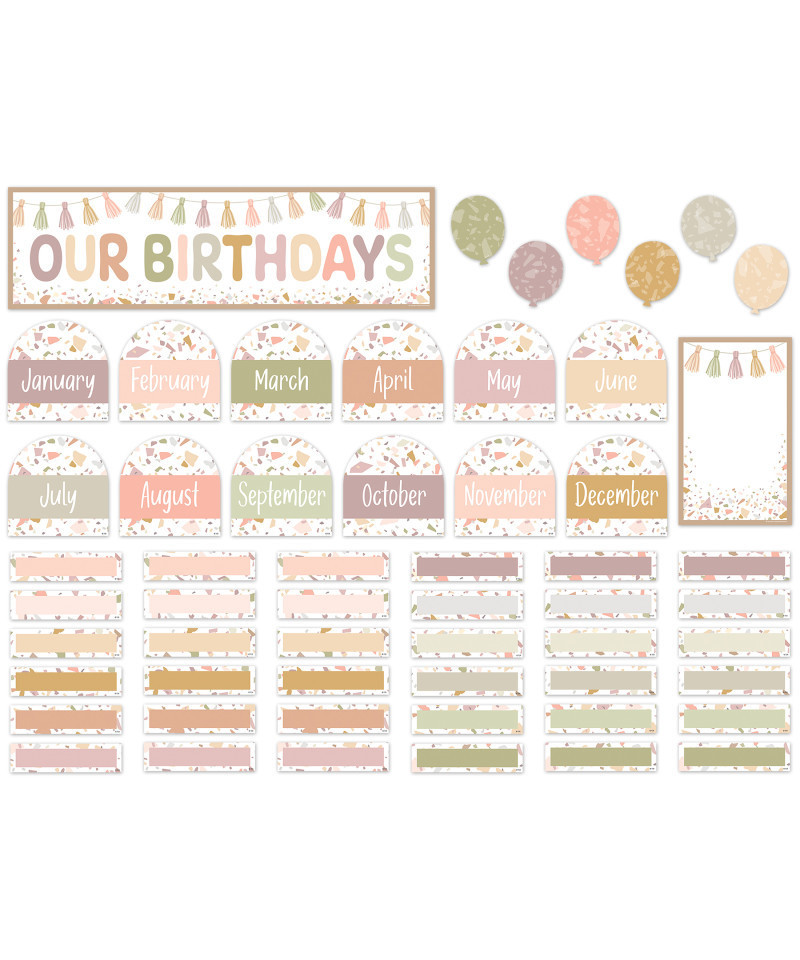 - Features: 1 "Our Birthdays" title piece, 12 monthly headers, 1 decorative frame, 6 balloon accents, 36 labels, Bulletin board guide with suggestions and activities