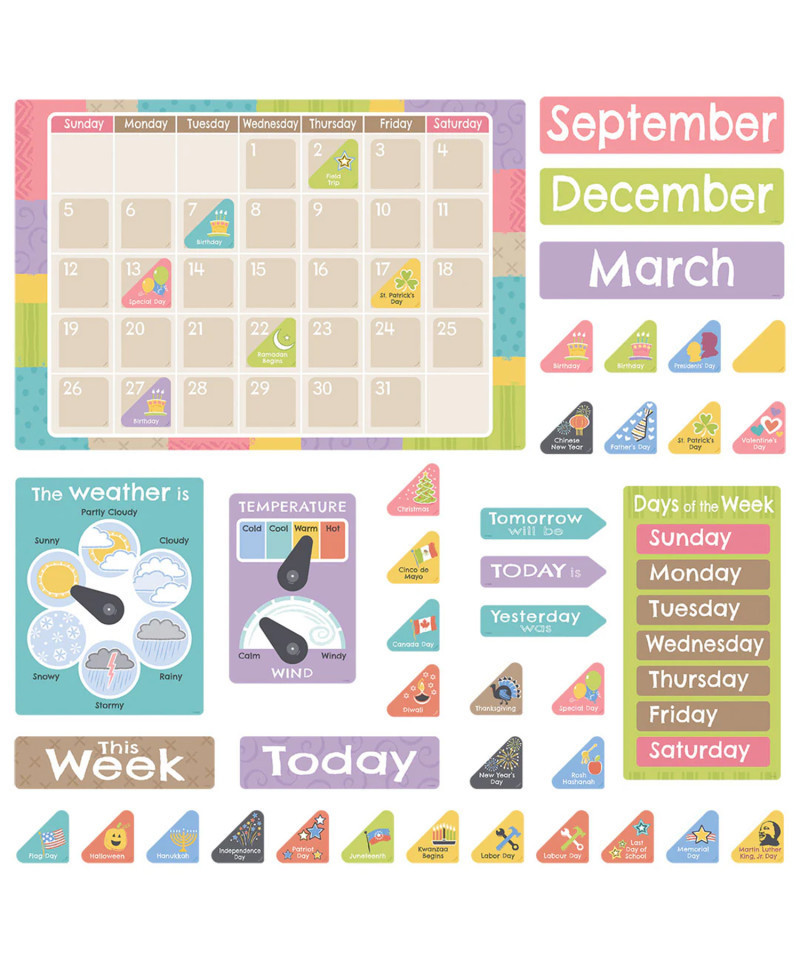 Bring the soothing colors of nature into your space with the Good to Grow Calendar Bulletin Board Set. Celebrate special days, and learn calendar and weather basics. Pieces slide easily into calendar slots. Includes a 17-1/2" x 25-1/2" calendar, 12 month headers, 33 date markers, 44 holiday/special day markers, Today and This Week headers, a chart for days of the week with Today, Tomorrow, and Yesterday markers, plus weather and temperature/wind charts with 4 pointers.