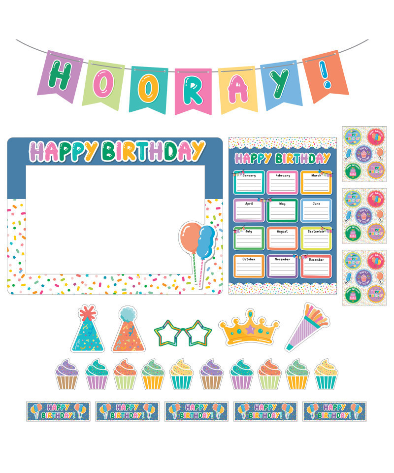 Turn your next birthday party into an unforgettable celebration with Carson Dellosa's Birthday Decoration Set! The 92-piece set of party decorations includes a "Hooray" happy birthday banner that is made up of 7 pennants (7.74" x 4.73") that go on a 4' string. The birthday decorations set also includes a 22" x 16" photo booth frame, 8 photo booth props (ranging from 3.42" x 4.34" to 4.26" x 6.12") with holders, a 11" x 16" birthday chart, 6 sheets of stickers (4.5" x 5.625"), 30 birthday bookmarks (6.5" x 2"), and 30 cupcake bulletin board decorations (2.44" x 3.2"). Create festive bulletin board and wall décor with the banner and bulletin board decorations, and party favors with the stickers and bookmarks. Make a fun photo booth station to take celebratory pictures with silly photo props!