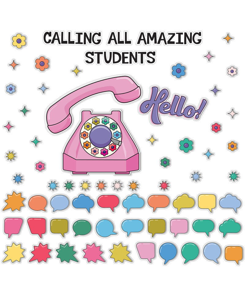 Cell-ebrate all your students hard work throughout the schoolyear by decorating your learning space with the Retro Remix Hello! Calling All Amazing Students Motivational Bulletin Board Set! The 71-piece bulletin board set includes a 5-piece header (45.6" x 3.15" to 15" x 8.77") 3-piece telephone (22.59" x 17.26"), 30 speech bubbles (Largest: 5.11" x 5.13", Smallest: 4.51" x 4.53"), 10 flowers (Largest: 3.56" x 3.82", Smallest: 2.58" x 2.64"), 12 twinkles (2.68" x 2.58"), and 11 starburst classroom decorations (2.79" x 2.66") to dress up your bulletin board, white board, cork board, or wall décor with ease. Use the speech bubbles to create name labels for students, while using the retro décor to accentuate student work displays that will inspire them to keep up the good work. Retro Remix, designed by Stephanie and Loreal of @HappilyEverElementary, partnered with Carson Dellosa to bring some fun, retro vibes to your learning environment.