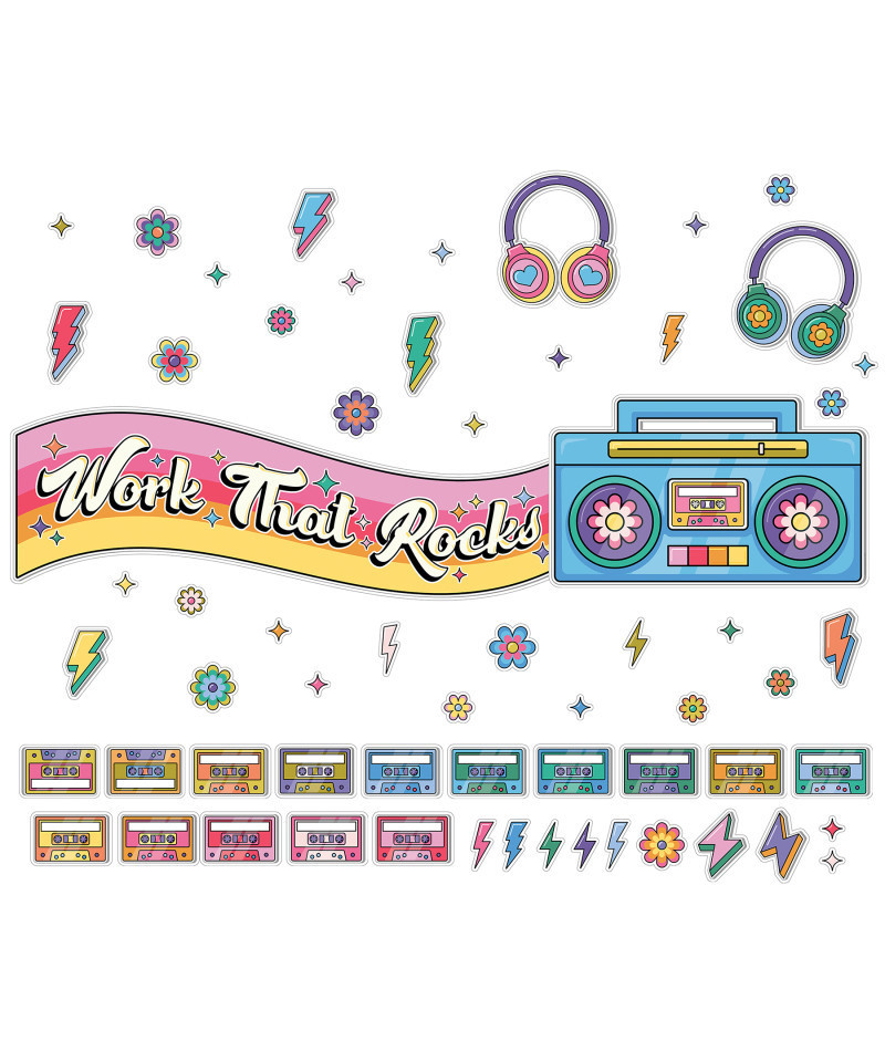 Put your students hard work at center stage by decorating your learning space with the Retro Remix Work That Rocks Motivational Bulletin Board Set! The 79-piece bulletin board set includes a 2-piece header ( 37.13" x 12.11" once assembled), boom box (21" x 12.67"), 2 headphones (8" x 9"), 30 cassette tapes (5.32" x 3.54"), 13 flowers (Largest: 3.31" x 3.31", Smallest: 2.15" x 2.15"), 15 lightning bolts (Largest: 3.25" x 4.77", Smallest: 1.56" x 3.39"), and 16 twinkle classroom decorations (1.68" x 1.68") to dress up your bulletin board, white board, cork board, or wall décor. Use the cassette tapes to create name labels for students, while using the other retro décor to accentuate student work displays that will inspire them to keep up the good work. Retro Remix, designed by Stephanie and Loreal of @HappilyEverElementary, partnered with Carson Dellosa to bring some fun, retro vibes to your learning environment.