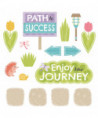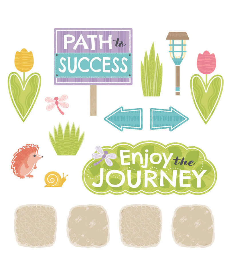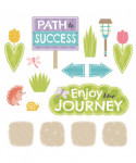 Lay out a path to success! Inspire goal setting and progress tracking with this engaging display set. Walk the Journey to 100 days of school, or track growth toward a reading challenge, fundraising goal, or reward. There are endless ways to display your garden path using all the stones or just a few at a time. Add colorful critters to establish milestones, relay messages, and set the scene. Nature-inspired colors and textures make this set fun for decorating classrooms as well as playrooms, libraries, community spaces, and hospitals. 45 pieces including 20 stepping stones, garden bench (16" wide), 6 plants and flowers, 9 critters, 3 path lights, and 6 pathway signs. Printed with vivid, fade-resistant inks on durable paper stock. Resealable storage bag included. Made in USA.