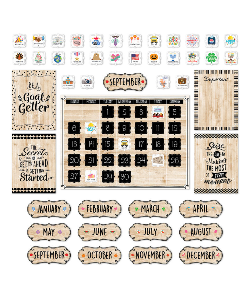This charming calendar set features black and white core patterns on a neutral wood background and is perfect for classrooms in which students are already calendar literate. As students get older, a growing number of activities, responsibilities, and interests compete for their time, and it is increasingly on them to manage it all successfully. The Black, White, and Wood Calendar Set is designed for this age group and provides the perfect tool for introducing concepts such as planning ahead, creating agendas, and setting goals. The inspiring mini posters included help support these skills. This 87-piece set includes a calendar chart, 12-month headlines, 31 pre-numbered calendar days, 23/30, 24/31, and 2 blank calendar days, 35 coordinating holiday and special day cards, and 4 motivational mini posters. This bulletin board set also comes with an instructional guide that includes teaching tips for reminding students of the importance of time management, goal setting, and pursuing their dreams. Coordinates with Core Décor products.