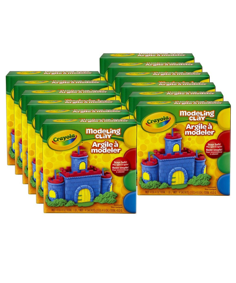 Tactile, easy to work with, and soft to the touch, Crayola Modeling Clay is designed especially for kids' hands. The clay makes an ideal first sculpting compound and can help children develop an early sense of form and finesse. This set contains four different colors of modeling clay: red, blue, yellow, and green. These vibrant colors are great for sculpting play houses, figures, flowers, and more. With one pound of clay in total, this set of modeling clay offers enough materials for small and large projects alike. Combine it with other sets to expand your color options. Completely nontoxic, the clay is safe and suitable for young children ages 36 months and up. The clay is also designed to scrape easily off most surfaces, making cleanup a breeze. Each pack includes 1 lb of Crayola Modeling Clay, 4 ounces each of 4 basic colors: red, blue, yellow, and green. Sold as 12 packs for a total of 12 lbs of clay.
