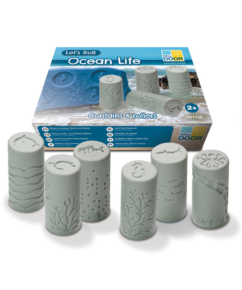 Explore precious and enticing ocean habitats with this set of creative rollers. Roll into play dough or clay and use the stamps to bring the water to life with a variety of sea creatures. Count the dolphins diving in the water, follow the fish through the bubbles and create tactile story adventures for the whole cast of characters! Children can practice their motor skills using different amounts of pressure and rolling in different ways, time and time again. The set includes the following ocean creatures and their habitats: dolphin and waves, turtle and coral, fish and bubbles, seahorse and seagrass, shark and fish, octopus and cave. Made from our durable stone mix, each set contains six rollers (each measuring approximately 3" x 1-1/4") and are easy to clean. Safe for age 2+.