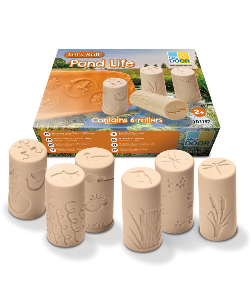 Let's go pond dipping! There are so many discoveries to be made with this set of intriguing rollers. As you roll and stamp into play dough or clay, reveal the hidden stories of what lives in and around our ponds. Match the frogs to the lily pads, hide the fish in the weeds, see how the dragonfly darts through the cattails, all while creating satisfying sensory art. Children will develop the muscles in their hands as they press and roll in different ways. The set includes the following pond life: frog and lily pads, fish and weeds, duck and pond, kingfisher and perch, water strider and duckweed, dragonfly and cattails. Made from our durable stone mix, each set contains six rollers (each measuring approximately 3" x 1-1/4") and are easy to clean. Safe for age 2+.