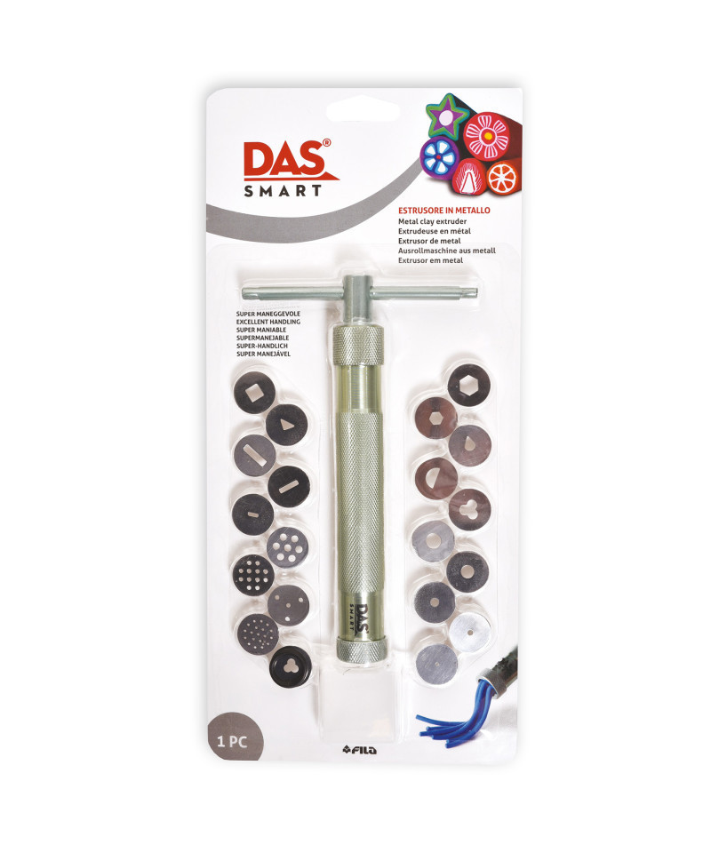 The DAS Smart Extruder is simple to handle and extremely rugged. Simply load the aluminum extruder and use the twist handle to advance the material. It is equipped with 20 interchangeable stainless steel discs to create different shapes and motifs.