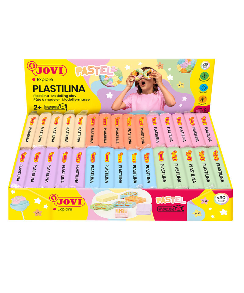 With JOVI plastilina, the possibilities are endless. Mold and shape with ease, or unleash your creativity by experimenting with molds and other techniques. JOVI plastilina delivers unmatched versatility and fun. Parents can rest assured knowing that JOVI plastilina is gluten-free and safe for even the youngest artists. Let your child's imagination soar as they dive into the colorful world of JOVI plastilina – where creativity knows no bounds! Sold as a display box of 30 individually wrapped, 50 gram bars of plastilina modeling clay in pastel green, pastel blue, pastel purple, pastel pink, pastel yellow, and pastel orange (5 bars each of 6 colors).