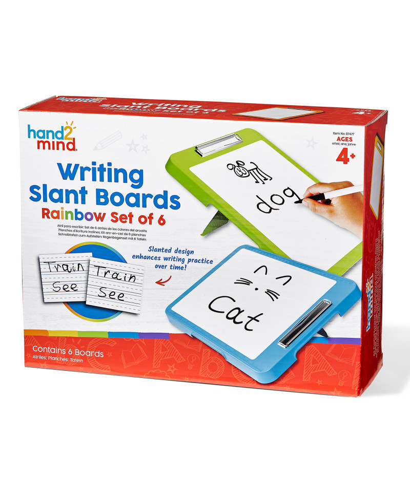 Add a splash of color to your classroom with this ergonomically designed writing surface! These rainbow-colored slant boards encourage proper posture, minimizing strain and fatigue during writing activities. Developed to support posture, the slanted design enhances writing practice, builds writing proficiency, and enhances letter formation and handwriting over time. Designed with a write-on/wipe-off surface and a built-in clipboard, these boards can be used horizontally and vertically. Easy-to-grip handles make the boards portable and convenient to use anywhere. Use the attached clip for paper or write directly on the dry-erase surface for endless writing practice! Sized to fit A4 and 8.5 x 11 paper in both orientations. Trays are stackable and easy-to-grip for convenient storage and comfortable handling. This set includes 6 Rainbow Writing Slant Boards.