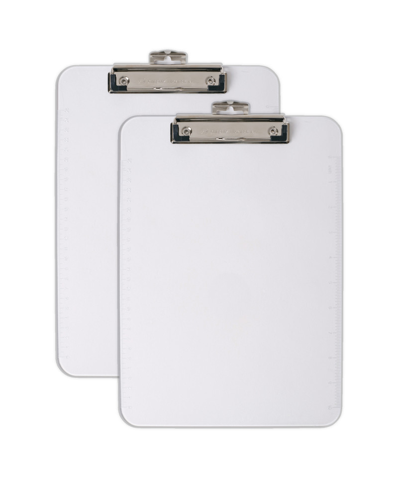 Stay organized and efficient with this clear letter-size clipboard made from tough, injection-molded plastic. Designed with smooth edges for comfort and durability, it features a low-profile clip with rubber grips to securely hold your papers in place without damaging them. A convenient pull-out hook on the back allows you to hang it for easy storage or display. Built right into the edge is a handy 12-inch ruler with inches on one side and centimeters on the other, making it a multifunctional tool for school, office, or job sites. Sleek, strong, and versatile, this clipboard is a smart solution for everyday tasks. Sold as a pack of 2.