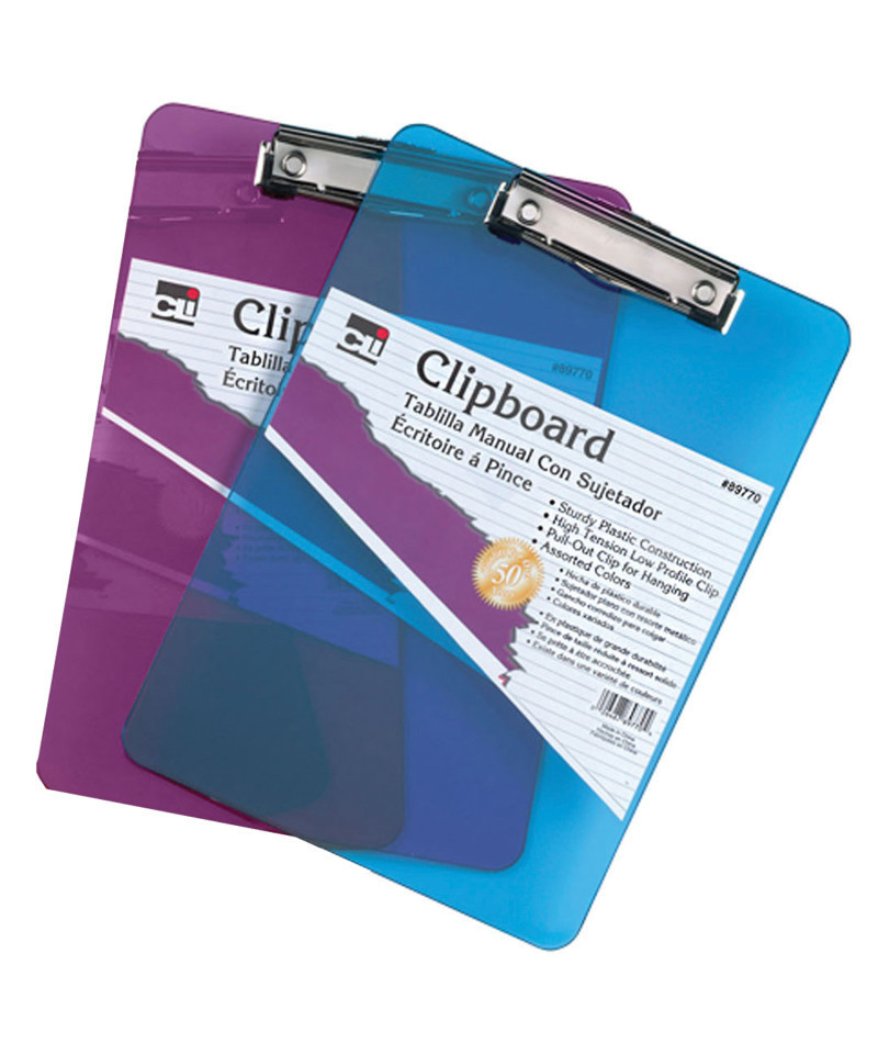 Brighten up your workspace with this tough, transparent clipboard, made from durable injection-molded plastic with smooth, comfortable edges. Designed in vibrant assorted neon colors, this clipboard adds a modern touch to any school, office, or home setting. It features a low-profile clip with rubber grips to hold papers securely in place without tearing. A built-in 12" ruler along the edge, with measurements in both inches and centimeters, adds extra convenience. Plus, the pull-out hook allows for easy hanging and storage. Sized to fit standard letter-size documents, this clipboard is both practical and stylish. Sold as a pack of 2 in Purple, Blue, Green, or Orange (color randomly selected).