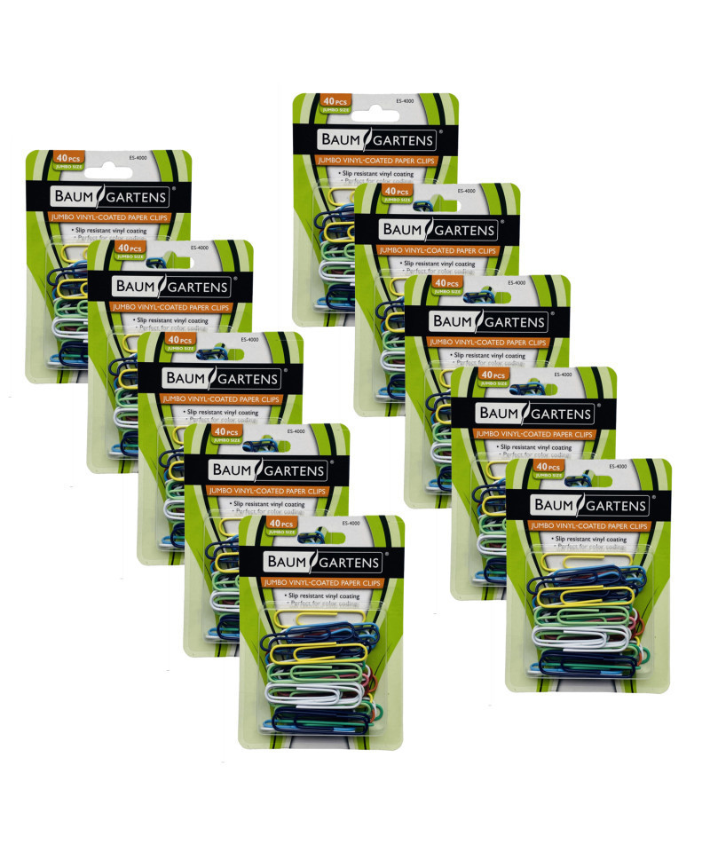 When you need a big clip for a big job, Baumgartens Jumbo Vinyl Paper Clips are perfect for bigger jobs like holding cards or papers together, bookmarking pages or clipping files. Stylish and coated in a colorful vinyl, these clips are great for the office, home or classroom. Each pack includes 40 jumbo, 2" paper clips per pack. Sold as 10 packs for a total of 400 paper clips.