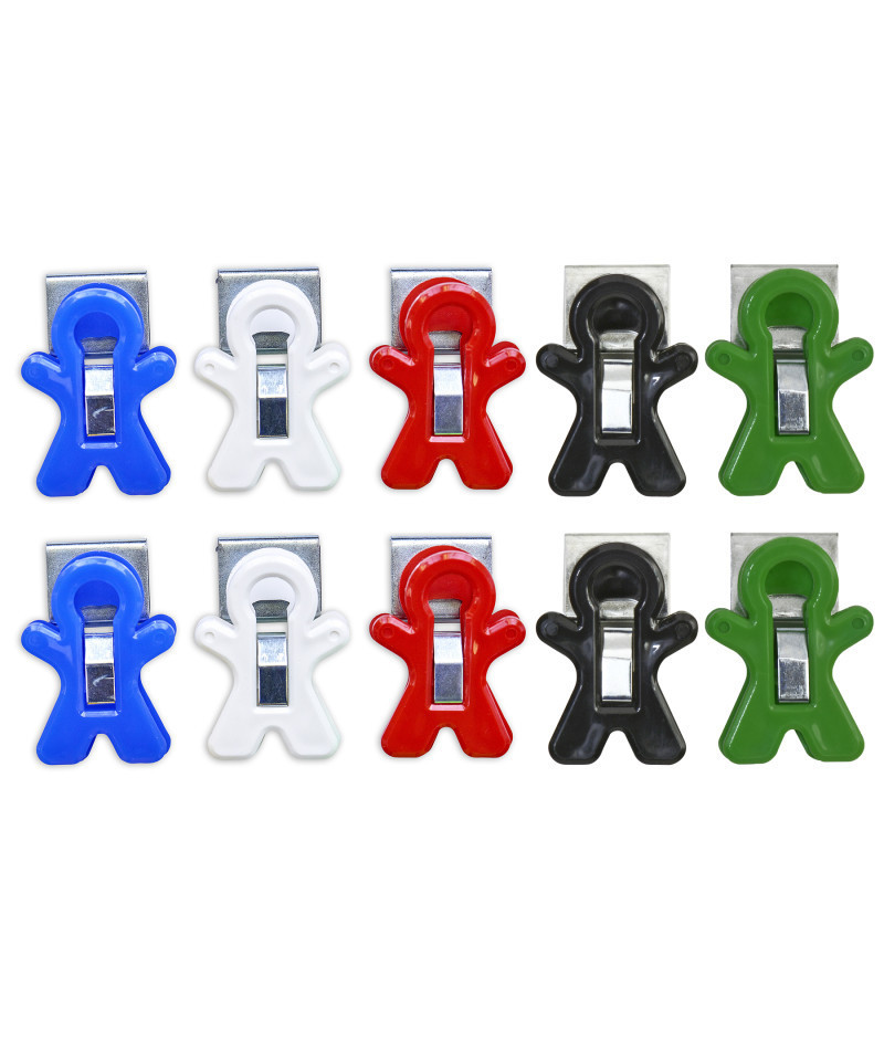 The strong magnet holds even heavy items easily and securely. Attach to filing cabinets, refrigerators and any other magnetic surface. Sturdy clip holds papers, notes, signs and more. Fun person-shape. Sold as a pack of 10 in assorted colors (no color choice).