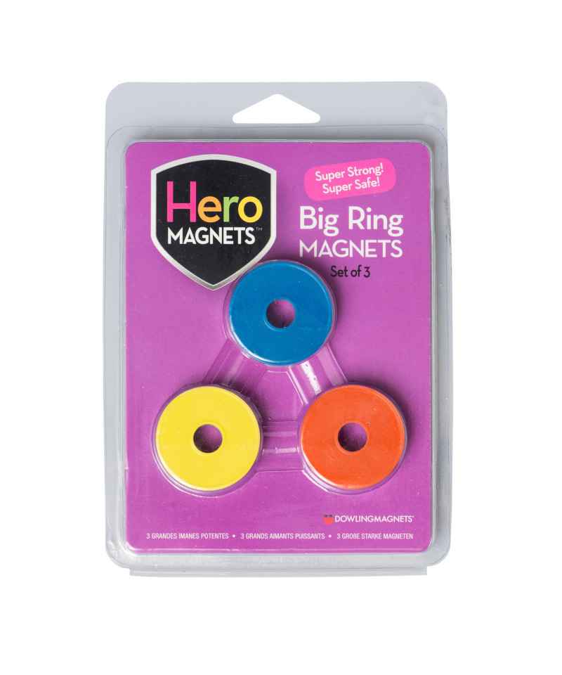 In search of safe magnets to use in the classroom or in a children's environment? Hero Magnets to the rescue! Chunky size with magnets completely encased in plastic. Strong display magnets help you get, and stay, organized. Great for whiteboards, filing cabinets, fridges, and more. Each set includes 3 bi-color magnets--flip them over to see a different bright color! Big Rings are 1.375"D x .50"T and hold about 13 pieces of paper.