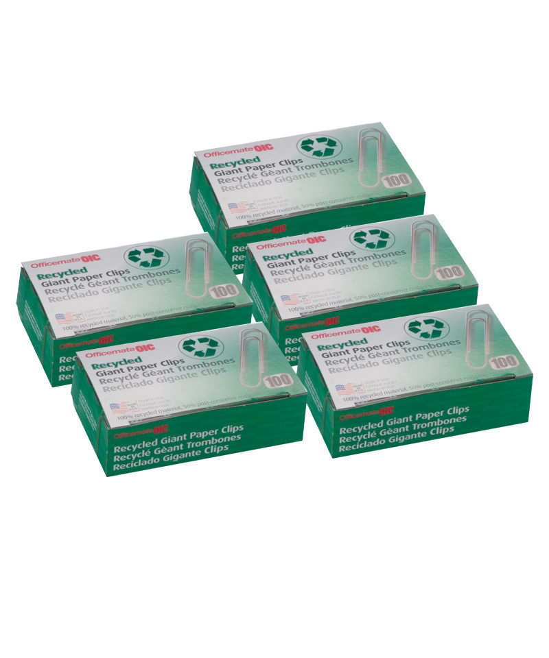 Recycled paper clips deliver the same holding capacity as standard paper clips. Giant size paper clips made from 100% recycled material. Made in USA. Each box includes 100 paper clips. Sold as 5 boxes for a total of 500 paper clips.