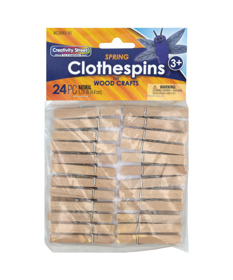 Natural wood spring clothespins are a great addition to any arts and crafts project. They are easy to paint and stain, and can be used to create animals, seasonal decorations, and much more. Large spring clothespins are 1.75" in length, and accept many type of glues. Add thumb tacks for bulletin board accents, or use to hang artwork on a clothesline display. Each pack includes 24 pieces.