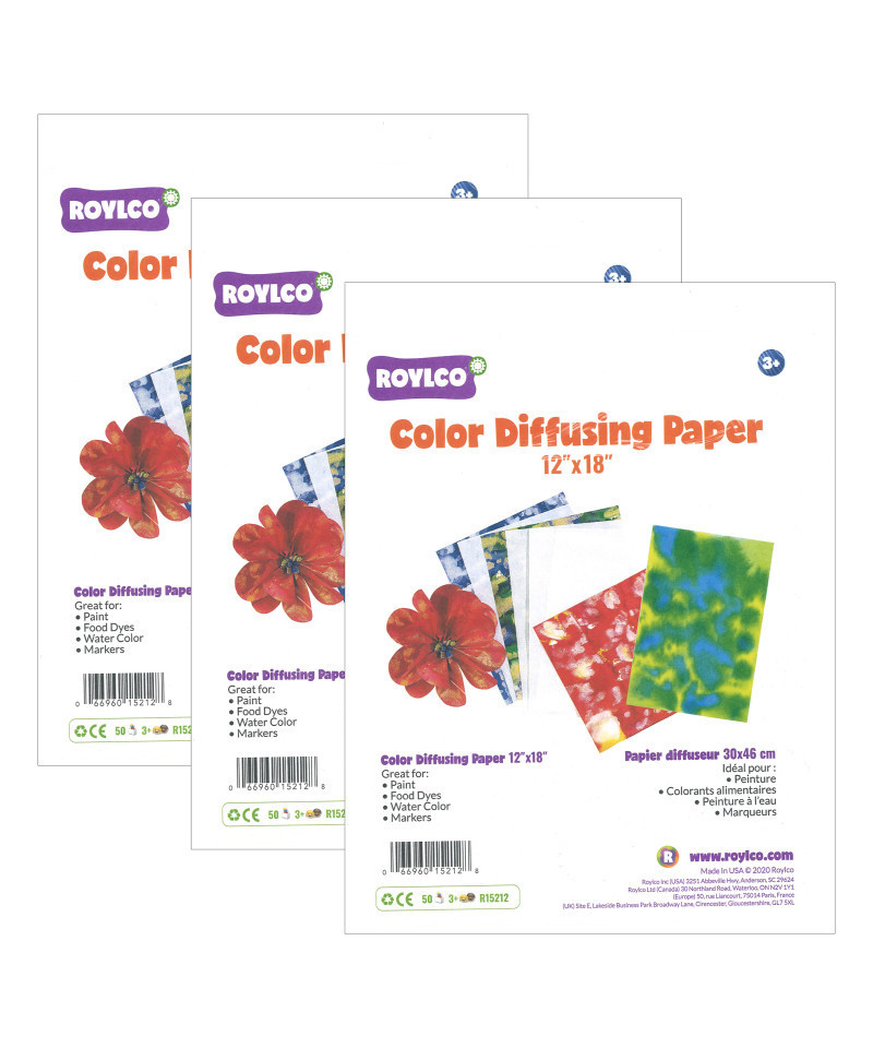 Color Diffusing Paper is a fabric-like paper with great texture. Spritz liquid watercolor, paint or food color over the color diffusing paper and watch the colors flow and blend to create spectacular patterns and effects. Once the paint is dry, embellish with markers, crayons and glitter. Once complete, hang in windows, from ceilings, on bulletin boards or anywhere that could use some extra color. Great easy art project for all ages and skill levels. 12 x 18" (30 x 46 cm). Each pack includes 50 sheets. Sold as 3 packs for a total of 150 sheets.