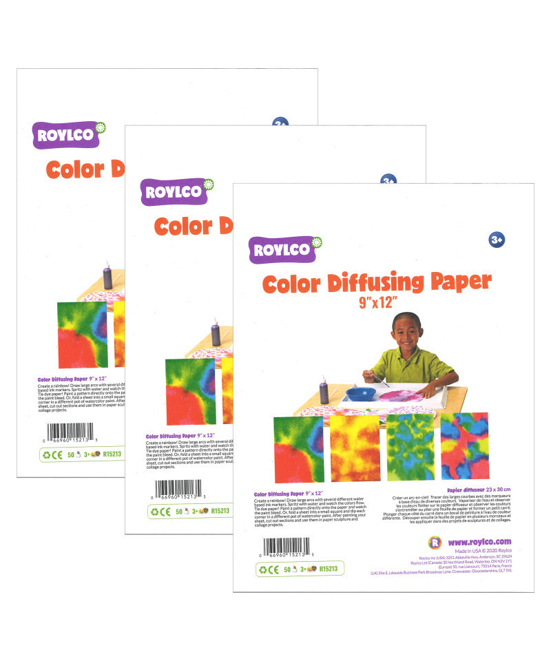 Color Diffusing Paper is a fabric-like paper with great texture. Spritz liquid watercolor, paint or food color over the color diffusing paper and watch the colors flow and blend to create spectacular patterns and effects. Once the paint is dry, embellish with markers, crayons and glitter. Once complete, hang in windows, from ceilings, on bulletin boards or anywhere that could use some extra color. Great easy art project for all ages and skill levels. 9 x 12" (23 x 30 cm). Each pack includes 50 sheets. Sold as 3 packs for a total of 150 sheets.