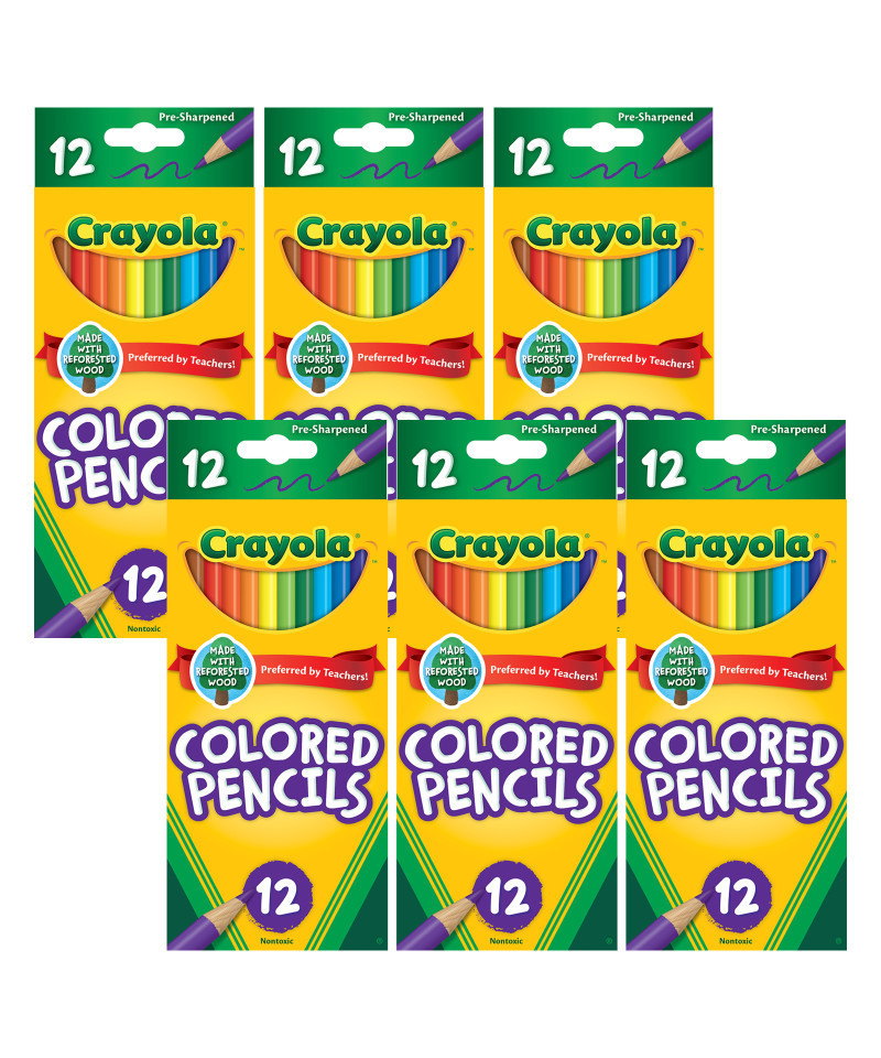 Colored pencils are an indispensable tool at home and in the classroom, ideal for creating and coloring maps, completing art or science projects, and making signs and labels. Crayola Colored Pencils have an easy-to-grip design for better control and are made with thick, soft lead, so they won't break easily under pressure. Kids will love to use these durable, vividly colored pencils. Small enough to fit in a book bag, this portable box holds a variety of colors. The smooth colors are perfect for color mixing and blending as well as for practicing more detailed techniques. Crayola Colored Pencils are created from reforested wood instead of wood from old-growth forests. For every tree used in the manufacturing of Crayola Colored Pencils, a new tree is planted. Includes Crayola Colored Pencils, 12 Count. Sold as 6 packs, 72 pencil crayons total.
