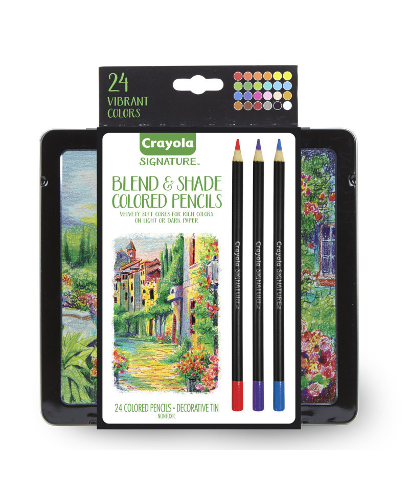 Crayola Signature Blend & Shade Colored Pencils are the perfect tools for your creative coloring projects. The velvety-soft cores provide a color-rich, smooth laydown—excellent for blending, shading and adding detail to any work of art. Vibrant colors laydown brilliantly on light or dark paper. Includes 24 Colored Pencils in a decorative storage tin.