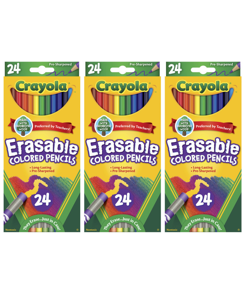 Crayola Erasable Colored Pencils make it easy to change drawings and fix mistakes. Now kids can complete picture-perfect homework assignments, maps, and reports in color—without having to start over. Erasable colored pencils are an indispensable tool at home and in the classroom. They are ideal for creating maps, completing art or science projects, and making signs and labels—and changing them. Crayola Erasable Colored Pencils are made with thick, soft lead, so they won't break easily under pressure. Kids will love to use these durable, vividly colored pencils. Small enough to fit in a book bag, this portable box holds a variety of colors. The smooth colors are perfect for color mixing and blending as well as for practicing more detailed techniques. Crayola Erasable Colored Pencils are created from reforested wood instead of wood from old-growth forests. For every tree used in the manufacturing of Crayola Colored Pencils, a new tree is planted. Each box includes 24 Crayola Erasable Colored Pencils. Sold as 3 boxes for a total of 72 pencils.
