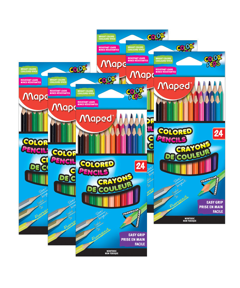 Bright and fun colored pencils provide hours of vibrant fun! Maped Color'Peps Triangular Colored Pencils feature a 2.9mm core with pigment that goes down smooth and but resists breakage, making them perfect for all types of drawing and writing. More comfortable than a standard pencil, the triangular body naturally indexes your fingers in the correct spot for more comfortable use and is recommended by teachers! The unique shape also stops the pencils from rolling when used on an inclined desk, while still sharpening cleanly in any standard pencil sharpener. Non-toxic and AP approved, each pack includes the following 24 colors: Dark Black, Xtra White, Silver, Gold, Dune, Woody Brown, Gaïa, Fruity Orange, Sunny Yellow, Fluo Yellow, Blush, Light Red, Red Kiss, Strawberry, Lovely Pink, Marshmallow, Eggplant, Deep Blue, Marina Blue, Blue Lagoon, Bubble Blue, Green Golf, Jade, and Apple Green. Sold as 6 packs for a total of 144 pencils.