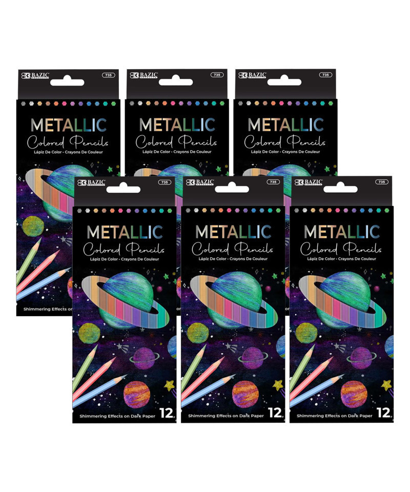This is a set of metallic colored pencils, the metallic particles in the color cores work great on darker color medium such as black colored paper, great for artists who want a little extra metallic shine on their masterpiece. Adding rich detail to drawing with highly-pigmented colors gives your work a lasting impression. Our metallic pencils provide just the right level of metallic shine. Our professional colored pencils feature an even color laydown and smooth coverage. Easy to blend and provides ample shading. Great for drawing, coloring, sketching, and shading. These colored pencils come pre-sharpened and ready for you to discover the beauty and calming nature of coloring. Ideal gift for adults and children. The colored pencils are high quality which is perfectly suited for satisfying all your drawing needs. The tip of the pencils is highly durable in nature and does not break easily. Each pack includes 12 colored pencils. Sold as 6 packs for a total of 72 colored pencils.