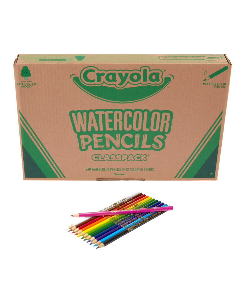 Stock up on Crayola Watercolor Pencils for the whole classroom to share! This 240ct Bulk Watercolor Colored Pencils set features 12 assorted colors including: Sky Blue, Red, Blue, Magenta, Orange, Violet, Brown, Yellow, Green, Yellow Green, White, and Black. These unique Colored Pencils work with water to create fun watercolor effects, as well as dry for a more traditional coloring experience. With sticks of each color, this box is designed to last through DIY crafts, arts and crafts projects, and homework assignments all year long. Made from reforested wood and pre sharpened for easy use, Crayola is committed to providing premium quality drawing tools for artists of all ages. Safe and nontoxic, ideal for children ages 3 and up. Featuring 240 thick, presharpened watercolor pencils; (20 each of 12 different colors) with a 3.3 mm lead diameter for grade school use.