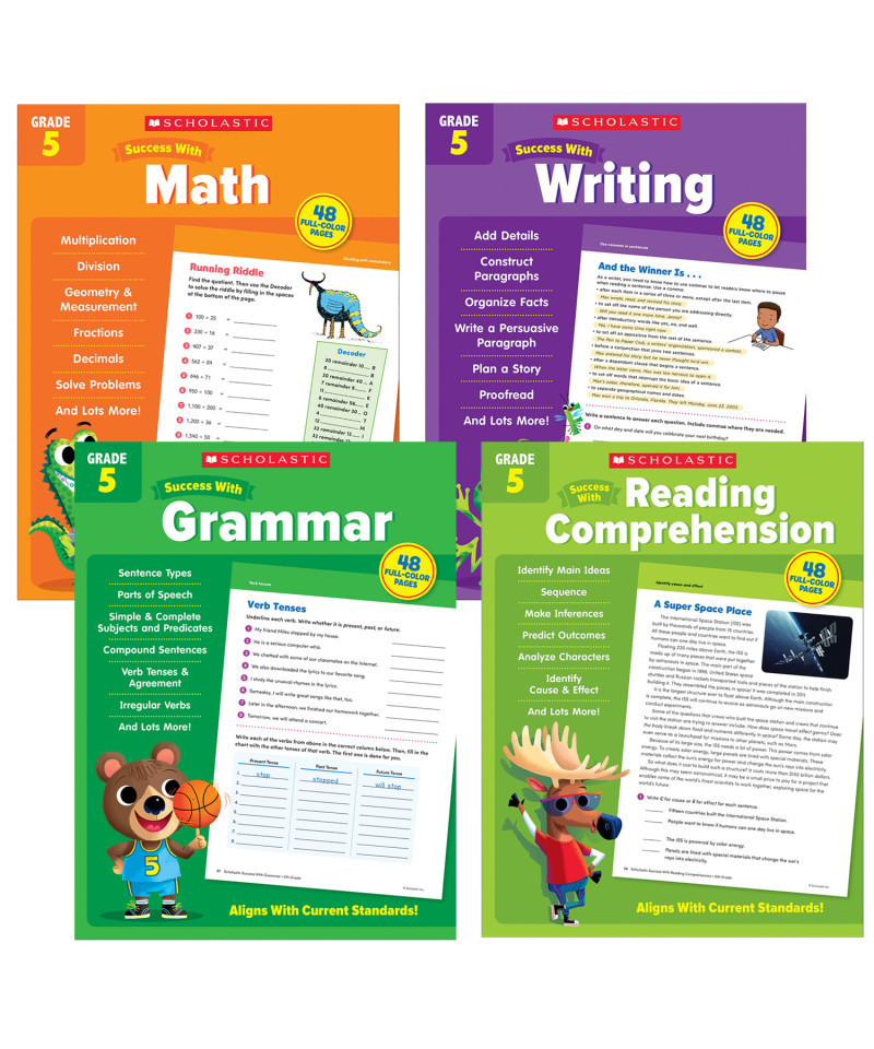 Give students the targeted, skill-building practice they need with these best-selling books! Each book has more than 40 ready-to-use and easy-to-follow engaging activities designed to help teach and reinforce essential skills. The 41 exciting books in this series provide invaluable practice kids need to master key learning skills! This bundle includes four fifth grade workbooks: Success With Grammar, Success With Math, Success With Reading Comprehension, and Success with Writing.