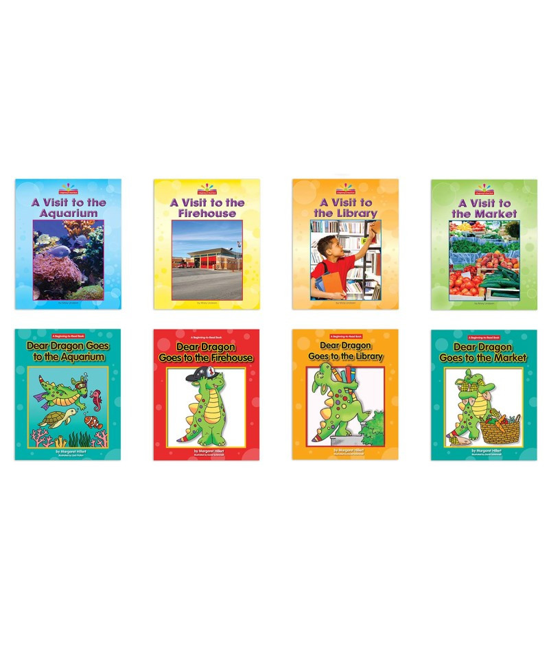Books in the Community Places set include: A Visit to the Aquarium, Dear Dragon Goes to the Aquarium, A Visit to the Firehouse, Dear Dragon Goes to the Firehouse, A Visit to the Library, Dear Dragon Goes to the Library, A Visit to the Market, and Dear Dragon Goes to the Market.