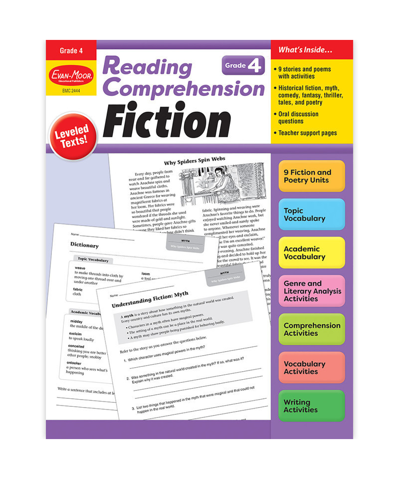 Build strong reading comprehension skills with leveled fiction stories and comprehension activities! Engage fourth-grade students in high-quality reading comprehension lessons that include eight fiction genres, reading selections and dictionaries, oral discussions, comprehension activities, literary analysis activities, and writing prompt activities.