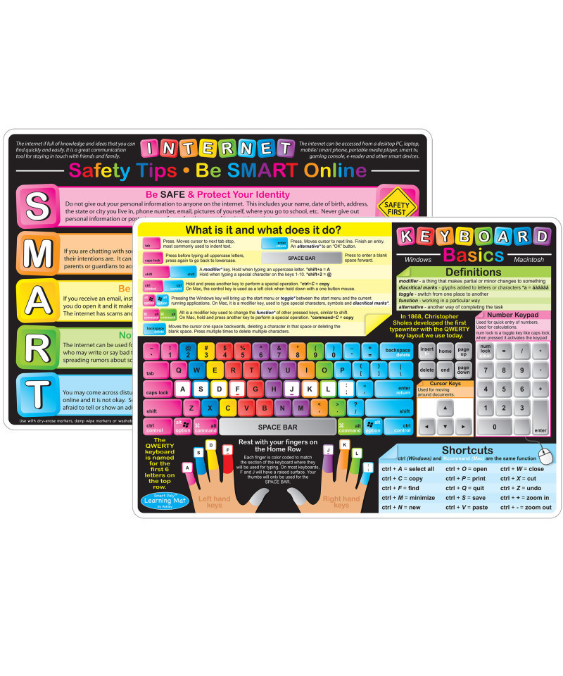 Smart Poly™ material has been designed for the classroom and home. The material is strong, durable, water resistant, and does not need lamination. QWERTY keyboard and beginner keyboard knowledge on the front, SMART online practices on the back. Heavy duty double-sided surface for fun and colorful learning on both sides. Write-on/wipe-off surface. Use with dry erase or water based markers and washable crayons. Each side is an interactive lesson. Mat measures 12" x 17".