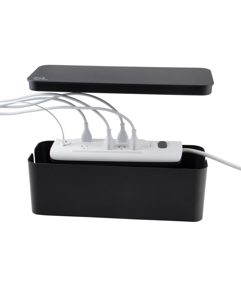 - No need to unplug cords, simply drop surge protector in CableBox and run cords through the openings on either end
