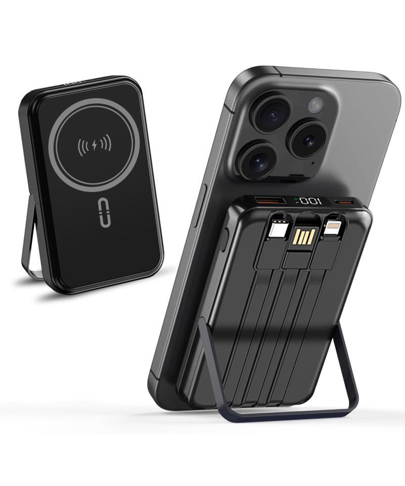 Stay powered anywhere with the 10,000mAh Magnetic Wireless Power Bank, the ultimate portable charging solution for iPhone users on the go. Designed with a high-density 10,000mAh battery, this compact power bank provides reliable, all-day energy—charging your iPhone 16/15/14/13/12 Pro up to two times and iPhone 16/15/14/13/12 Pro Max & 16/15/14/13/12 Plus up to 1.5 times. Featuring strong magnetic adsorption technology and nano-grip precision, it securely attaches to your device for seamless MagSafe-style charging. The LED digital display lets you monitor exact battery levels at a glance, while the built-in foldable stand allows hands-free use—perfect for watching videos or video calls during charging. With triple device support (wireless + Lightning + Type-C), this multifunctional charger lets you power up multiple devices simultaneously. Features 3 built-in cables, 1x Lightning output, 1x Type-C output, and 1x USB-A input, Compact, lightweight, and designed not to block your camera, it's the ideal travel companion for work, trips, or everyday use.