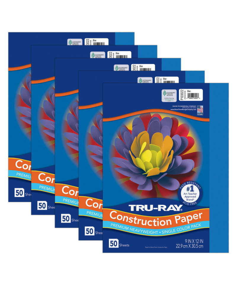 Heavyweight 100% vat-dyed sulphite with longer, stronger fibers. Tru-Ray® Construction Paper is tough enough to take scoring, folding and curling without cracking and tearing. Its superior fade-resistance keeps projects brighter and fresher longer. Available in 28 stay bright colors. Acid free for less fade. 50% recycled fiber content and recyclable. Measures 9" x 12". Each pack includes 50 sheets. Sold as 5 packs for a total of 250 sheets.