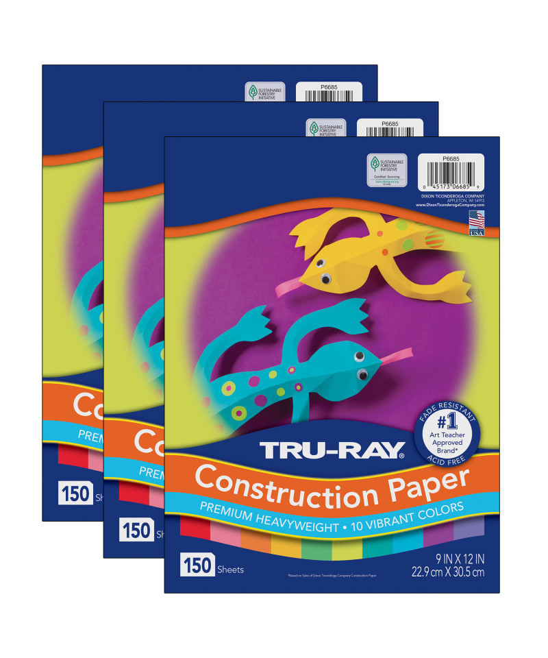 Heavyweight 100% vat-dyed sulphite with longer, stronger fibers. Tru-Ray® Construction Paper is tough enough to take scoring, folding and curling without cracking and tearing. Its superior fade-resistance keeps projects brighter and fresher longer. Colors include: Magenta, Festive Green, Turquoise, Brilliant Lime, Violet, Atomic Blue, Shocking Pink, Pumpkin, Gold and Festive Red. Acid free for less fade. 50% recycled fiber content and recyclable. Measures 9" x 12". Each pack includes 150 sheets. Sold as 3 packs for a total of 450 sheets.