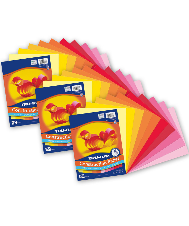 Heavyweight 100% vat-dyed sulphite with longer, stronger fibers. Tru-Ray® Construction Paper is tough enough to take scoring, folding and curling without cracking and tearing. Its superior fade-resistance keeps projects brighter and fresher longer. Colors include: Orange, Yellow, Electric Orange, Pink, Shocking Pink, Light Yellow, Pumpkin, Gold, Festive Red, and Holiday Red. Acid free for less fade. 50% recycled fiber content and recyclable. Measures 9" x 12". Each pack includes 150 sheets. Sold as 3 packs for a total of 450 sheets.