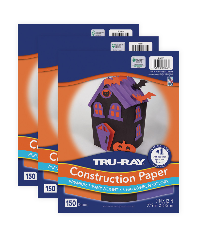 Heavyweight 100% vat-dyed sulphite with longer, stronger fibers. Tru-Ray® Construction Paper is tough enough to take scoring, folding and curling without cracking and tearing. Its superior fade-resistance keeps projects brighter and fresher longer. Halloween Assortment includes: Orange, Black, and Violet. Nice size assortment for classrooms, camps, and parties. Acid free for less fade. 50% recycled fiber content and recyclable. Measures 9" x 12". Each pack includes 150 sheets. Sold as 3 packs for a total of 450 sheets.