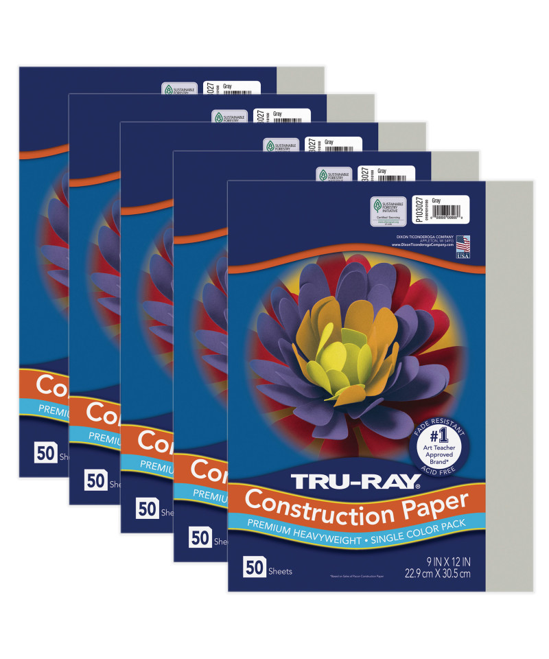 Tru-Ray® Construction Paper, Heavyweight, Gray, 9" x 12", 50 Sheets Per Pack, 5 Packs